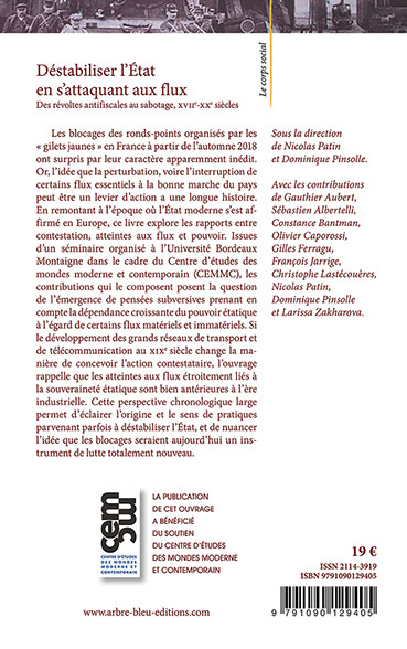 Les blocages des ronds-points organisés par les « gilets jaunes » en France à partir de l’automne 2018 ont surpris par leur caractère apparemment inédit. Or, l’idée que la perturbation, voire l’interruption de certains flux essentiels à la bonne marche du pays peut être un levier d’action a une longue histoire. En remontant à l’époque où l’État moderne s’est affirmé en Europe, ce livre explore les rapports entre contestation, atteintes aux flux et pouvoir. Issues d’un séminaire organisé à l’Université Bordeaux Montaigne dans le cadre du Centre d’études des mondes moderne et contemporain (CEMMC), les contributions qui le composent posent la question de l’émergence de pensées subversives prenant en compte la dépendance croissante du pouvoir étatique à l’égard de certains flux matériels et immatériels. Si le développement des grands réseaux de transport et de télécommunication au xixe siècle change la manière de concevoir l’action contestataire, l’ouvrage rappelle que les atteintes aux flux étroitement liés à la souveraineté étatique sont bien antérieures à l’ère industrielle. Cette perspective chronologique large permet d’éclairer l’origine et le sens de pratiques parvenant parfois à déstabiliser l’État, et de nuancer l’idée que les blocages seraient aujourd’hui un instrument de lutte totalement nouveau.