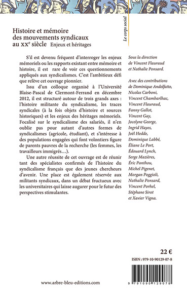 S’il est devenu fréquent d’interroger les enjeux mémoriels ou les rapports existant entre mémoire et histoire, il est rare de voir ces questionnements appliqués aux syndicalismes. C’est l’ambitieux défi que relève cet ouvrage pionnier.
