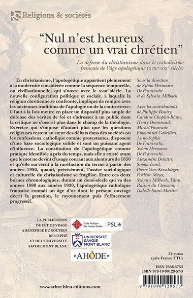 En christianisme, l’apologétique appartient pleinement à la modernité considérée comme la séquence temporelle, ou civilisationnelle, qui s’ouvre avec le xviiie siècle. La nouvelle configuration politique et sociale, à laquelle la religion chrétienne se confronte, implique de rompre avec les anciennes traditions de l’apologie ou de la controverse : il faut à la fois mettre en place un dispositif plus ample de défense des vérités de foi et s’adresser à un public dont la critique ne s’inscrit plus dans le champ de la théologie. Exercice qui s’impose d’autant plus que les questions religieuses restent au cœur des débats dans des sociétés où les confessions, catholique comme protestantes, disposent d’une base sociologique solide et sont un puissant agent d’influence. La constitution de l’apologétique comme pratique identifiée a pris du temps, mais elle a existé avant que le mot ne devînt d’usage courant aux alentours de 1850 et qu’elle survécût à la raréfaction du terme à partir des années 1950, quand, précisément, l’assise sociologique et culturelle du christianisme se fragilise. Entre ces deux bornes chronologiques, durant un demi-siècle qui va des années 1880 aux années 1930, l’apologétique catholique française connaît un âge d’or dont le présent ouvrage décrit la gestation, le rayonnement puis l’effacement progressif.