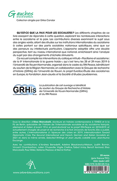 Ce recueil compile les interventions du colloque intitulé « Pacifisme et socialisme : de la IIe Internationale à la guerre froide », qui s’est tenu les 28 et 29 mars 2019 à l’Université de Rouen-Normandie, organisé dans le cadre du RIN Peace, bénéficiant du soutien de la Région Normandie, en collaboration avec le Groupe de recherche d’histoire (GRHis) de l’Université de Rouen, le projet EuroSoc-Étude des socialismes en Europe, la Fondation Jean-Jaurès et la Société d’études jaurésiennes.