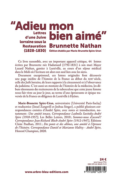 Ce livre rassemble, avec un important appareil critique, 44 lettres écrites par Brunnette née Hadamard (1792-1831) à son mari Mayer Lazard Nathan, gantier à Lunéville, au cours d’un séjour médical